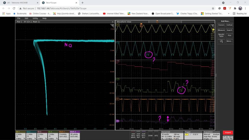 Figure 16: MSO64B Tektronix scope showing 2N3904 device XY curve traces as a plot, 4 probed channels, and 2 math waveforms with all signals in phase. Click the image to enlarge it.